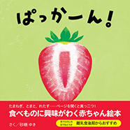 離乳食後期からおすすめの絵本です。たまねぎ、トマト、レタスなどがページをめくると真っ二つにぱっかーん! 包丁も描かれていますが、あたたかなタッチで描かれているので怖さを感じることなく楽しめます。抑揚をつけて楽しく読んでくださいね。